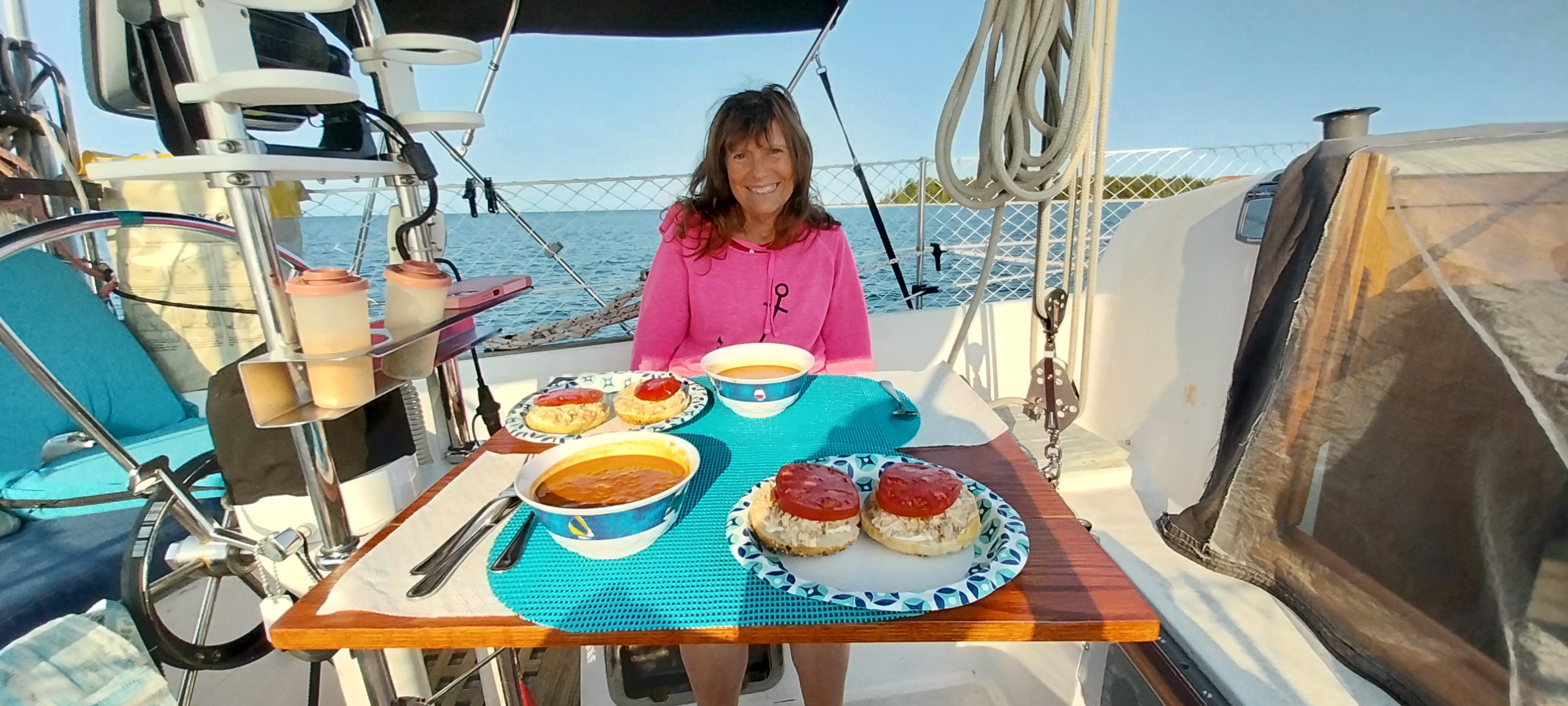 Next morning after breakfast and coffee, Melanie ran a few errands like laundry and last minute supplies and then we left and headed East towards Presque Isle. The wind was light so we motored and made a steady five to six knots. The wind gradually faded and then turned to the southeast which was against us. It gradually built until we were seeing guests over 20 with 2 to 3 ft waves! I raised the mainsail and we rolled up our large jib and used the staysail and the main to zig-zag our way into Presque Isle Harbor. Using just the motor it would have taken us 3 hours to go 4 miles but even though we Zig zagged and probably doubled the distance we were safely there within an hour or so. We dropped anchor, cleaned up and Melanie made us a hot bowl of soup and boat-lox, it’s the Cruisers version of Lox, smoked salmon and cream cheese with onion and tomato on a bagel. Only we use canned salmon and mix it with the cream cheese. It’s quite delicious. We watched a show on TV before falling into bed exhausted. We were asleep before 9:30!