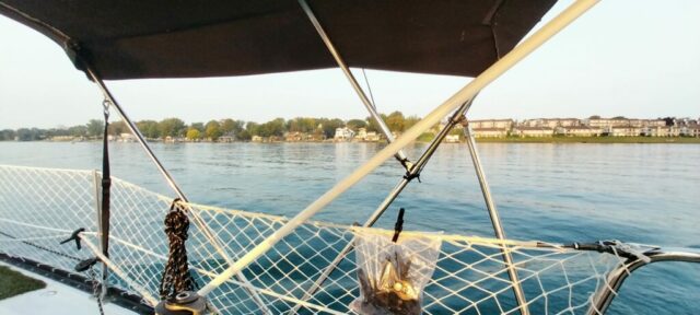 We enjoyed a delicious spaghetti and meatball dinner with brussel sprouts while the boat slowly wound its way into the main channel and then turned North toward Port Huron, our next destination. We were not able to fly the Yankee jib but the staysail was able to fill, so it gave us a little boost of speed against the current. Melanie made us a cup of tea and we sat and watched the sun slowly sink in the West. While doing so it colored the sky and clouds with the most beautiful oranges and pinks we have seen in quite a while. Once Darkness settled, we dressed for the cool night and Melanie laid down to catnap while I drove the boat through the darkness up the St Clair river. Things are very different when it’s dark and you really have to pay attention to the chart plotter and the various lights you see on the water. It’s quite nerve-racking because it’s hard to judge distances. After motoring through the darkness for what seemed an eternity, we arrived at Port Huron around 4:30 in the morning.