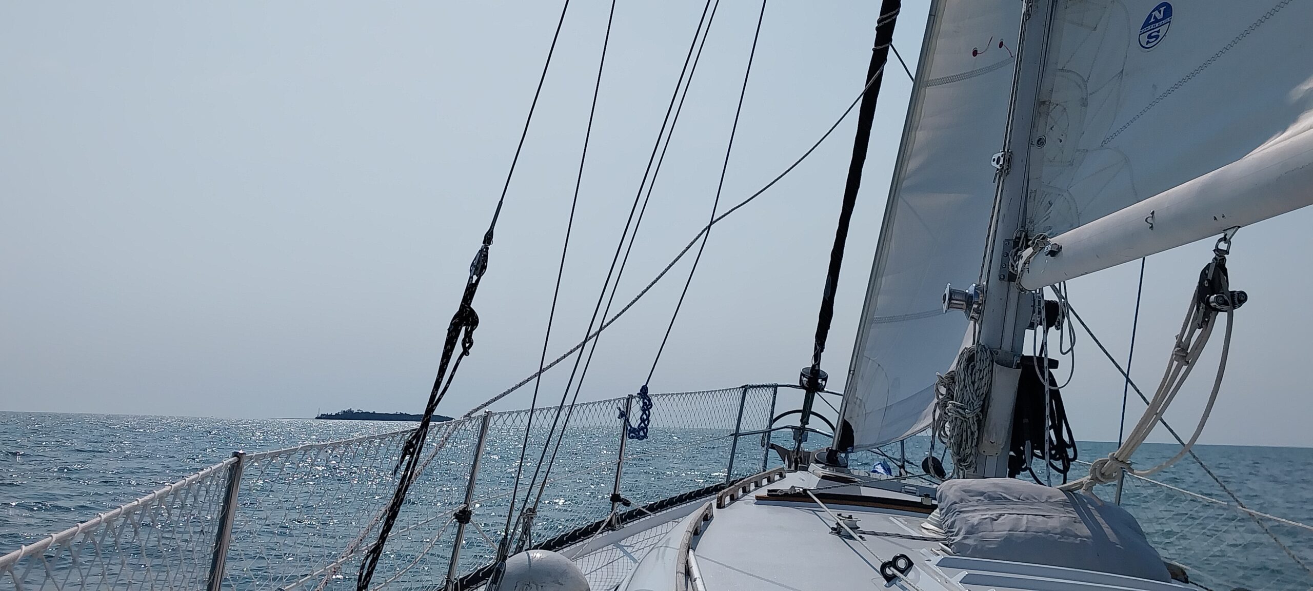 Tuesday came and went. The parts did not arrive. What really angered me was it arrived in Alpena at 11:00 a.m. on Tuesday morning, a bright sunny day with light winds, and UPS marked on my status delayed due to bad weather. They lied! I chatted with the parts company and they apologized, but it wasn’t really their fault it was UPS. The part finally arrived just after noon on Wednesday. I got to work putting it onto the boat and to my dismay, found that one side did not fit properly! I had to drill out a hole through stainless and got halfway before another boater arrived that had helped us a few days prior. Between the two of us we found some parts in my toolbox and with the addition of a bolt, a nut and a few washers, we engineered a jury rig so that my forestay would at least be in place for us to get home. I would need a different, larger turnbuckle. We won’t use the jib, only the staysail which has its own stay so the forestay will hold the Mast up but not be under any significant load. After getting everything in place and preparing for departure, we said our goodbyes and left around 4:30 p.m.. we had about 120 miles to do in order to reach Port Huron sometime Thursday.